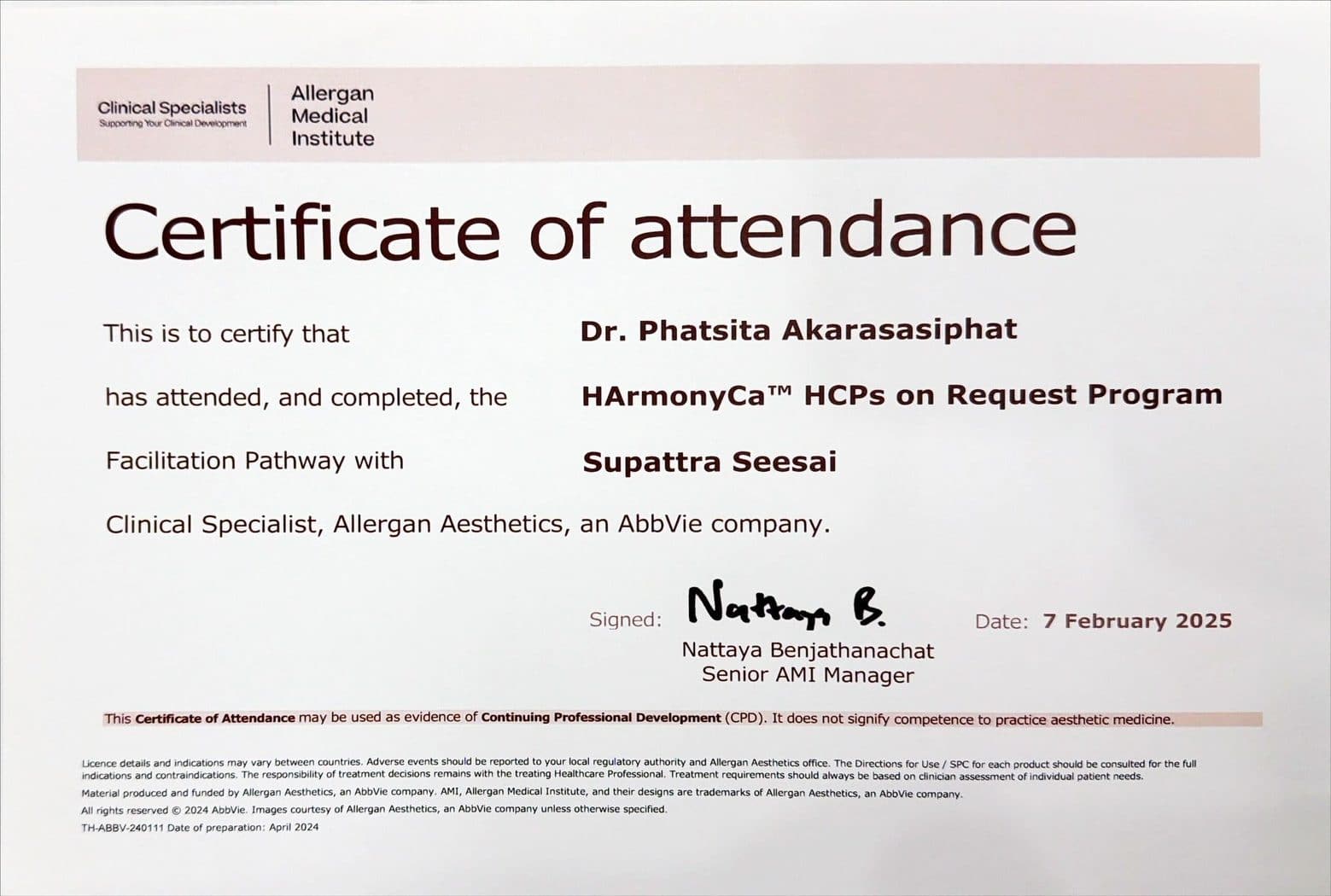 Certificate of attendance : Complete Flore focusing on eye rejuvenation Hand on Worksh Complete catct up emerging innovation in Aesthetic Medicine.