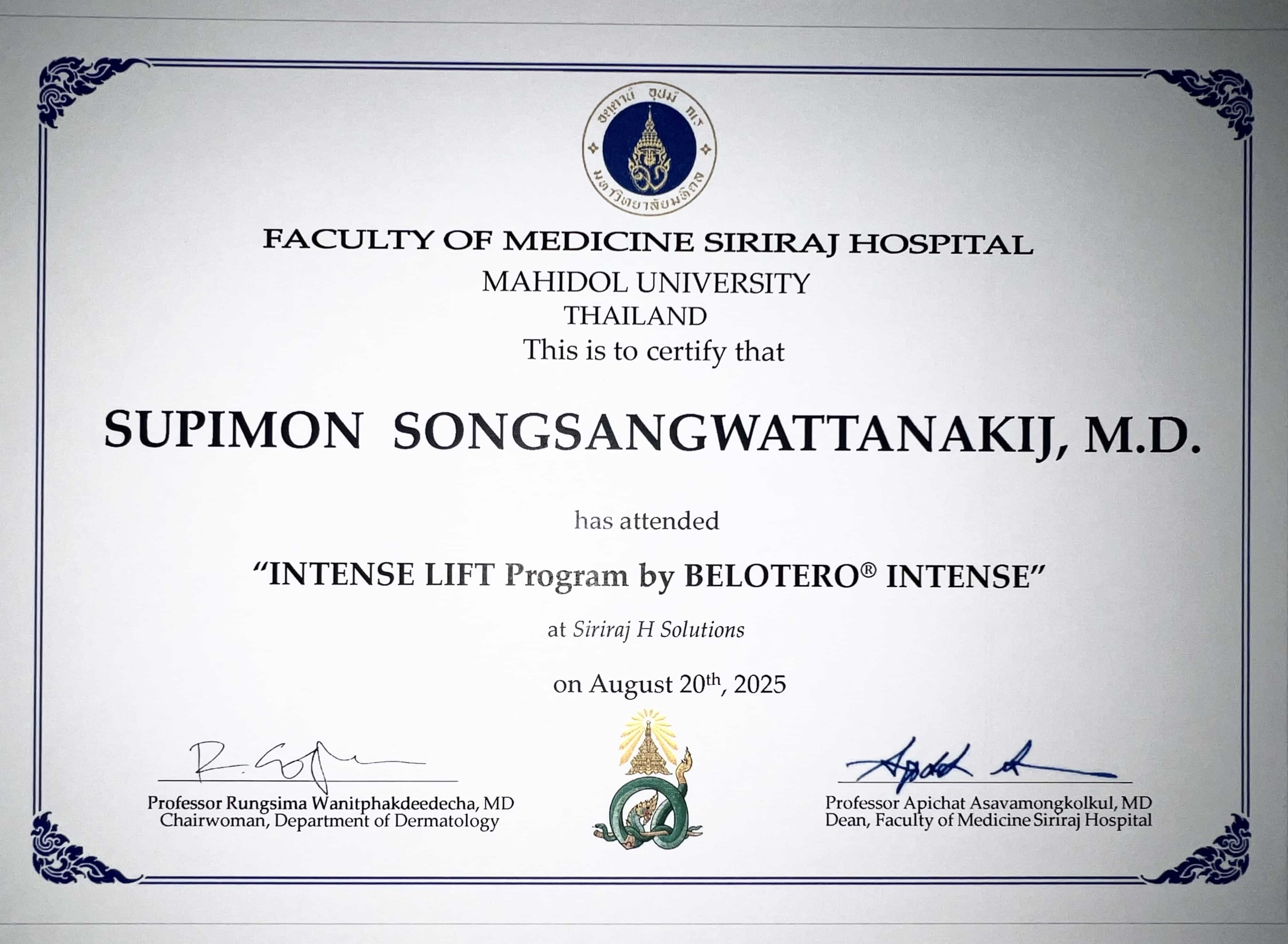 Certificate of Attendance : INTENSE LIFT Program by BELOTERO INTENSE, Faculty of Medicine Siriraj Hospital, Mahidol University